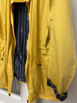 Parka de color amarillo vibrante con un forro interior a rayas azul marino y motivos náuticos. - Cierre de cremallera. - Bolsillos con solapa y botón. - Puños con detalle de rayas.