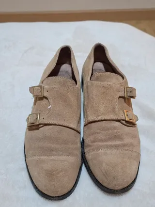 Mocasines de piel sintética en tonos beige y marrón. Cuentan con un diseño de doble hebilla. - Material exterior: Piel sintética. - Color: Beige y marrón. - Cierre: Doble hebilla. - Tienen poco uso y no están dañados