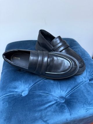 Elegantes zapatos Geox de color negro. - Diseño tipo mocasín. - Detalle de tiras acolchadas en la pala. - Ribete plateado en el contorno.