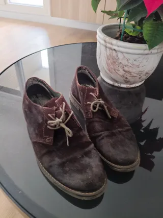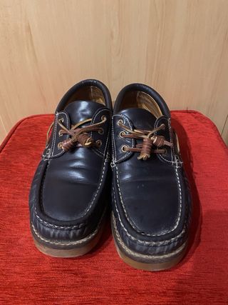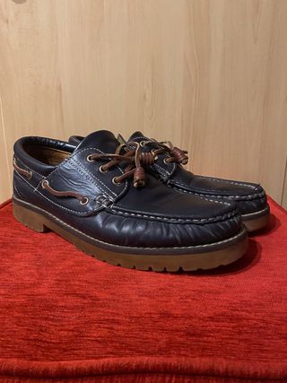 Zapatos náuticos de estilo clásico. Comprados en El Corte Inglés. - Exterior de cuero azul marino. - Cordones marrones. - Suela de goma marrón. - Costuras blancas decorativas. Usados durante un curso escolar. Se venden por cambiar de talla. Hechos en piel de alta calidad. Están bastante usados pero aún son más que aprovechables. Muy cómodos. Su precio es de 10€. Nuevos costaron 60€.