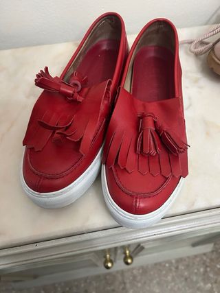 Mocasines rojos con cuerda blanca y ligero tacón, talla 40-41