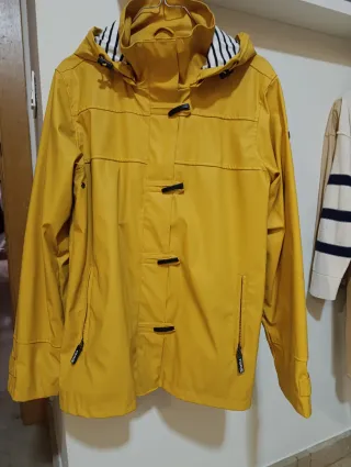 Chaqueta impermeable de la marca Batela, ideal para días de lluvia o viento. - Diseño náutico con forro de rayas. - Cierre de botón y cremallera. - Capucha ajustable.