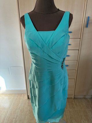 Elegante vestido de fiesta con un diseño favorecedor. - Escote en V. - Detalle de pedrería en un lateral. - Falda con volantes escalonados. -Todo forrado. -Cremallera en la espalda. -Pañuelo a juego.
