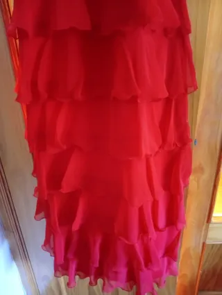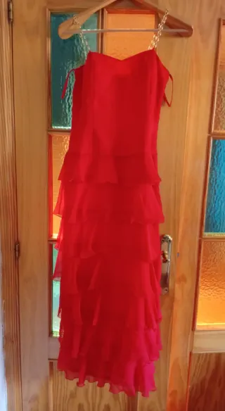 Elegante vestido largo de color rojo, con un diseño de volantes en cascada y tirantes de cadena dorada. - Diseño de volantes en cascada. - Tirantes con detalle de cadena dorada. - Largo hasta el tobillo.