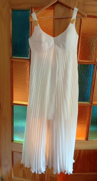 Elegante vestido largo con detalles plisados y adornos dorados en los tirantes. - Diseño con escote en V. - Falda larga con plisado vertical. - Adornos circulares dorados en los hombros.
