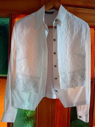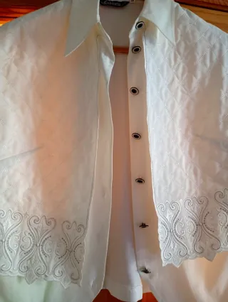 Elegante camisa de color blanco crudo con detalles bordados. - Diseño con bordados intrincados en la parte delantera. - Cuello clásico y cierre de botones. - Mangas largas.