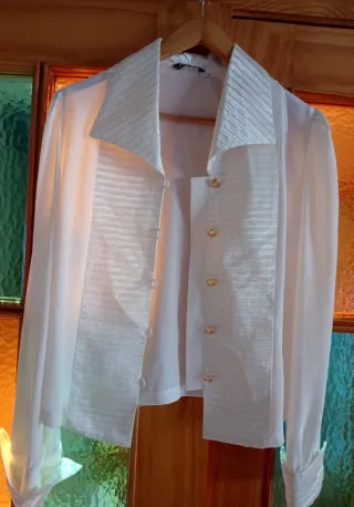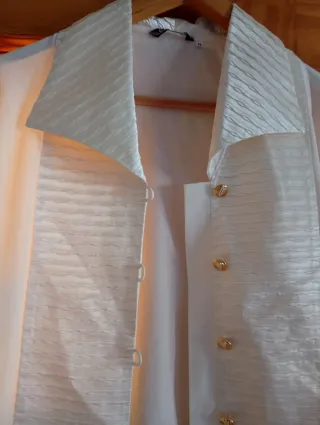 Elegante blusa de color blanco crudo con detalles de brocado. - Cuello camisero con textura. - Cierre de botones dorados. - Mangas largas con puños. - Tejido ligero y con caída.