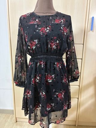 Vestido de manga larga con estampado floral. - Diseño con cintura elástica. - Tejido ligero y vaporoso. - Detalle de encaje en la cintura, mangas y cuello. -Transparente con forro interior.