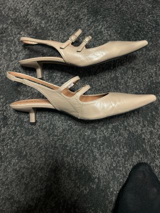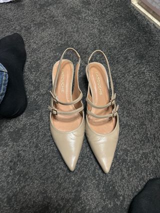 Elegantes zapatos de tacón con un solo uso. - Diseño de punta fina. - Tiras finas con hebillas. - Tacón de altura media.