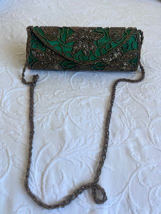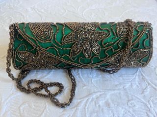 Elegante bolso de mano cilíndrico, perfecto para eventos especiales. - Diseño con forro de satén verde. - Adornado con intrincados bordados de pedrería dorada y cuentas. - Cadena fina para llevar al hombro.