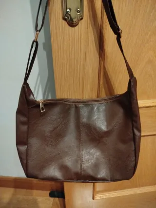 Bolso en color marrón. Se puede usar tipo bandolera ( es ajustable) o bolso de hombro. No es rígido, buena capacidad - Material: Piel sintética. - Cierre con cremallera.
