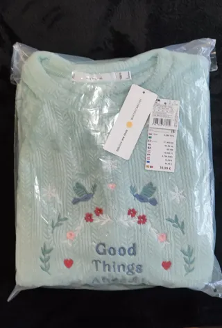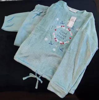 Conjunto de pijama de tejido polar suave, ideal para estar cómoda en casa. El diseño del top presenta un estampado de pájaros y flores, con la frase Good Things Ahead. - Tejido polar. - Diseño bordado en el top. - Cintura elástica en el pantalón. Marca Women Secret. Talla M. Totalmente nuevo.