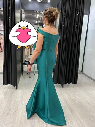 Se vende elegante vestido de fiesta largo en color verde. Un único uso. Con factura de tintorería. En perfectas condiciones. - Diseño de corte sirena. - Escote Bardot con tirantes finos. - Detalle de lazo en el hombro.