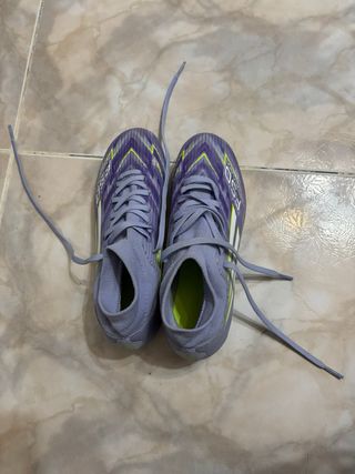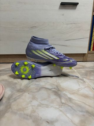 Botas de fútbol Adidas de caña alta con un diseño llamativo. - Color principal morado con detalles en verde lima. - Suela con tacos para césped. - Diseño de tres rayas característico de la marca. -Solo puestas dos entrenos -Numero 37-1/3