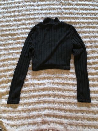 Top negro de terciopelo con un diseño acanalado. - Manga larga. - Cuello alto.