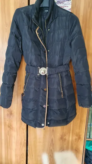 Cazadora larga con cinturón. Talla M. - Diseño acolchado. - Cierre de cremallera. - Bolsillos laterales con cremallera. - Cinturón con hebilla decorativa. Cómo nueva.