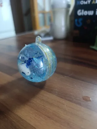 Adorno esférico que puede usarse como bola de Navidad o llavero. Su diseño combina tonos azules con detalles dorados. - Esfera transparente con purpurina. - Incluye un pequeño colgante o asa Por dentro cera gel y se puede añadir abalorios dentro