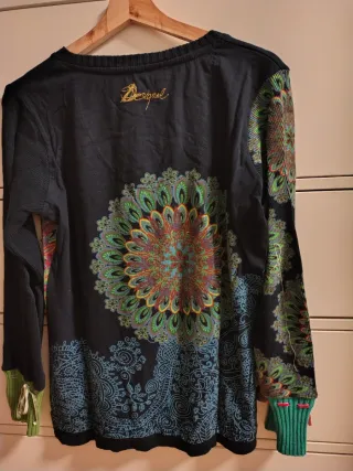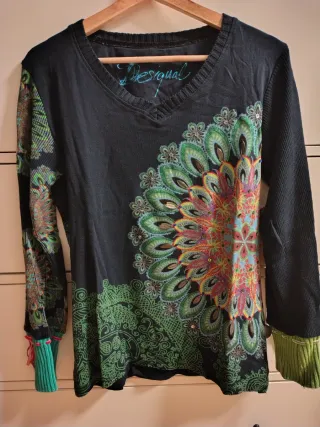 Jersey fino con un diseño vibrante y colorido. - Manga larga. - Cuello en V. - Estampado de mandala y motivos florales. - Puños y bajo con detalles de punto.