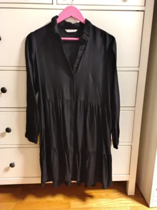 Vestido negro de Stradivarius con un diseño moderno y favorecedor. - Manga larga. - Cuello camisero. - Cierre de botones. - Volantes en la falda.