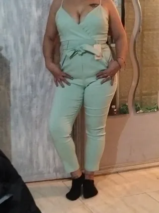 Mono elegante de color negro, sin estrenar. - Diseño con tirantes finos. - Piernas anchas y fluidas. - Detalle de lazo en la cintura.