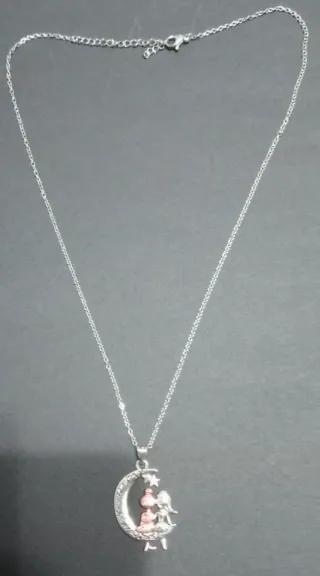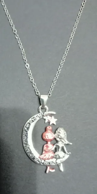 Collar con colgante de luna y dos figuras de mejores amigas sentadas en ella, con dos estrellas. - Diseño de luna creciente. - Figuras de amigas con detalles. - Cadena plateada.