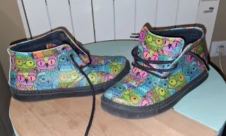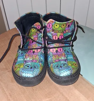 Botas artesanales con un diseño único y llamativo. - Estampado de búhos en múltiples colores. - Cierre con cordones negros. - Suela negra gruesa. - Ergonómicos, muy cómodas. -Poco uso.