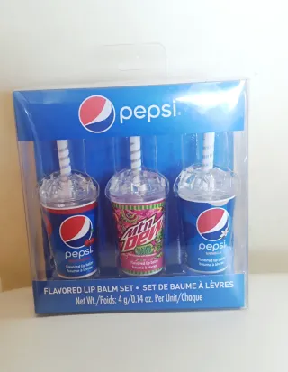 Conjunto de bálsamos labiales con sabor a refresco, con diseños de vasos de Pepsi y Mountain Dew. Este set incluye tres bálsamos labiales con sabores icónicos de Pepsi: Cherry Pepsi, Vanilla Pepsi y Mountain Dew Major Melon. Los bálsamos labiales vienen en un envase con forma de vaso de refresco, lo que les da un aspecto novedoso y divertido. Son una edición exclusiva de Claire's, lo que los hace un artículo de colección para los fans de Pepsi y los bálsamos labiales. Completamente nuevos,sin estrenar,en su embalaje ,con etiquetas. #PepsiColeccion #MountainDewFan #BalsamosLabiales #Coleccionismo #Novedades #ProductosExclusivos
