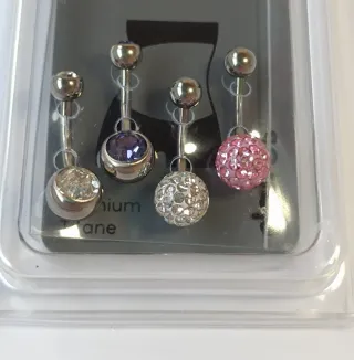 Set de cuatro piercings para el ombligo de titanio plateado con cristales de 14 g y 1,6 mm.El cierre es roscado exteriormente.De la marca Claire's.Completamente nuevos,sin estrenar,en su caja,con etiqueta. #PiercingsParaOmbligo #TitanioPlateado #Cristales #Claires #CierreRoscado #14g #1_6mm #CompletamenteNuevos #SinEstrenar #EnSuCaja #ConEtiqueta #Segundamano #JoyeriaParaPiercings #AccesoriosDeModa #PiercingsDeCalidad