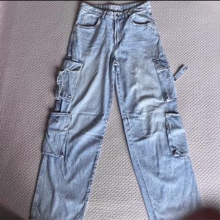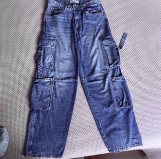Vaqueros de corte cargo en color azul. Tienen un diseño moderno y práctico. EN PERFECTAS CONDICIONES. - Bolsillos cargo laterales. - Cintura con trabillas para cinturón. - Cierre de cremallera y botón.