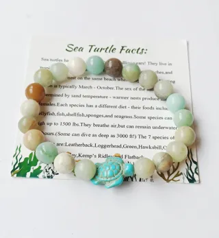 Pulsera hecha a mano con piedras naturales y un amuleto de tortuga marina. Esta pulsera representa la necesidad de proteger nuestros océanos de la contaminación para salvaguardar la vida marina.Medidas:18'5cm,es elástica. Viene con una tarjeta en inglés,en la parte delantera dice: Conservación de tortugas marinas: La interferencia humana ha provocado que las poblaciones de tortugas marinas disminuyan en todo el mundo, y la mayoría de las 7 especies se consideran amenazadas o en peligro de extinción. Una parte de las ganancias de la venta de esta pulsera se donará a Sea Turtle Conservancy (conserveturtles.org).