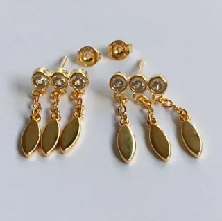 Teí Pendientes de plata bañada en oro(plata vermeil).Formados por tres circonitas talladas y tres colgantes.Cierre de tuerca.De orfebrería.Ideales para outfits de todos los días u ocasiones más especiales.Muy combinables,dan un toque trendy a cualquier look.Nuevos,sin estrenar. #Pendientes #colgantes #circonias #circonitas #pendientetriple #hoja #pluma #pendientesplata #pendientesoro #pendientesvermeil #joyeria #orfebreria #plata #oro #vermeil #joyas #joyasplata #joyasoro #joyasvermeil #nuevo #diferente #regalo #barato #calidad #tendencia #nuevo #segundamano #sinestrenar