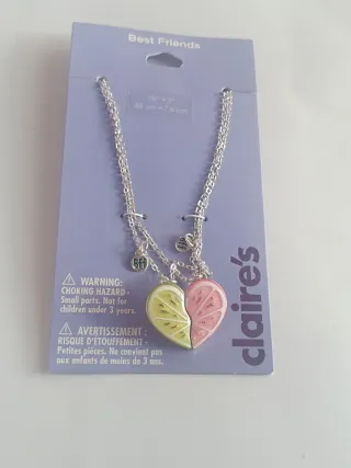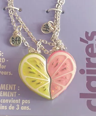Collares con colgante de corazón de lima y pomelo "Best Friends" de Claire's! Paquete de 2 unidades, completamente nuevos y con etiquetas. - Diseño frutal y divertido con corazones de lima y pomelo que se pueden conectar - Colgantes con dijes de "BFF" para mostrar tu amistad - Acabado en tono plateado elegante - Longitud: 16 + 3 pulgadas de extensor (40,64 + 7,62 cm) - Cierre de langosta seguro y ajustable - Material de metal de alta calidad Ideal para mejores amigas que buscan un accesorio divertido y significativo,fans de la marca Claire's y su estilo juvenil y alegrey quienes buscan un regalo único y especial para una amiga.