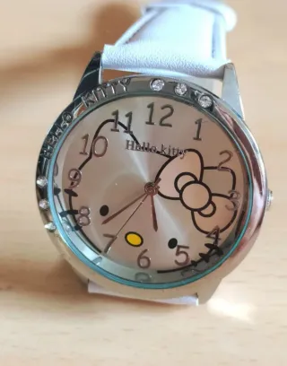 Reloj analógico (con agujas) de cuarzo Hello Kitty.Con dial redondo con la cara de Hello Kitty con su lazo rosa de fondo.El dial es de titanio y tiene gravadas las palabras Hello Kitty y tres circonitas transparentes incrustadas a cada lado.Correa en blanco de polipiel con cierre de hebilla.Impermeable.Completamente nuevo,sin estrenar.Ideal para fanáticos de Hello Kitty y niñas. Diámetro del dial 4cm. Espesor de la esfera 0,6cm. Longitud de la correa 24cm. Ancho correa:2cm.