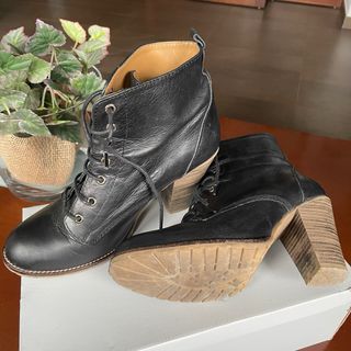 Botines de piel auténtica, por dentro y por fuera, con cordones y tacón. Muy buena piel, suave. Un básico para cualquier armario. Tal cual las fotos - Cierre de cordones. - Tacón de madera de 9 cm de alto - Detalle de costuras.