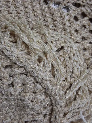 Elegante chaquetilla de fiesta en color beige. Su diseño es ligero y con un acabado suave y peludo, ideal para complementar tu atuendo. - Tejido con textura suave y peluda y brillante. - Diseño abierto en la parte delantera. - Mangas largas. -Pequeño desperfecto en la parte trasera, puesta apenas se aprecia.