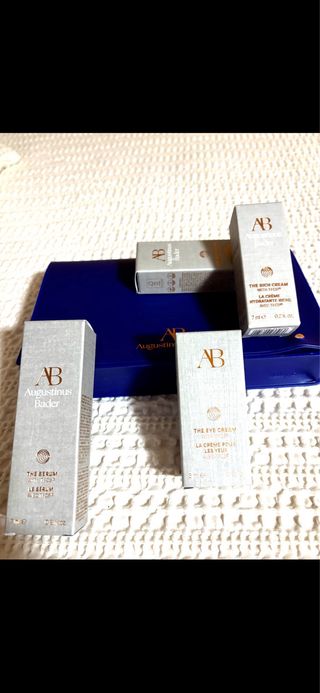 Lote de productos de cuidado de la piel de Augustinus Bader. - Incluye The Serum, The Body Cream, The Rich Cream y The Eye Cream. - Presentado en un neceser azul.