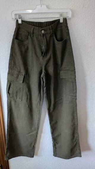 Pantalones cargo de color verde militar, con un diseño moderno. Son anchos y talle por el ombligo. Nuevos sin usar. Talla xs, al ser anchos tambien sirven para una s - Cintura elástica. - Bolsillos cargo en los laterales. - Cierre de botón y cremallera.