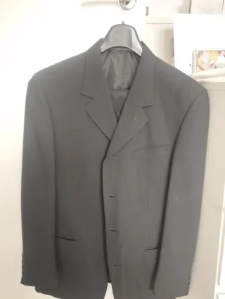 Traje de chaqueta y pantalón en color negro, talla 48. - Chaqueta con solapa de muesca. - Cierre de tres botones en la chaqueta. - Bolsillos de solapa en la chaqueta. - Puños con botones en las mangas.