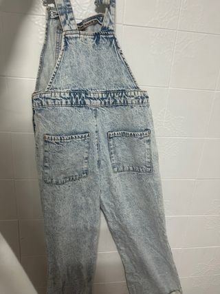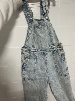 Mono vaquero con un llamativo diseño acid wash. - Tirantes ajustables con clips. - Bolsillos delanteros y traseros. - Cierre lateral con botones.
