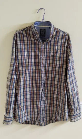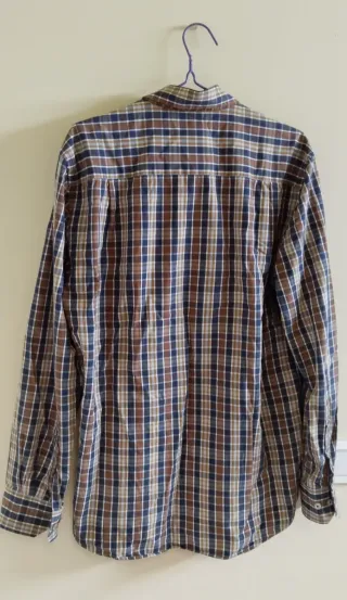 Camisa de cuadros de hombre. Es de manga larga. Tiene un pequeño defecto en el cuello (casi ni se ve), pero por lo demás está perfectamente cuidado. Muy cómoda.