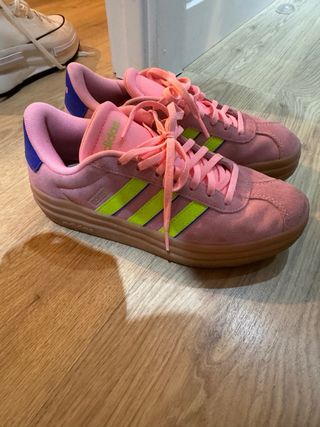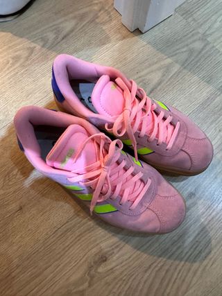 Zapatillas deportivas Adidas con un llamativo diseño. - Exterior de ante rosa. - Detalles de las tres rayas en verde lima. - Detalle azul en el talón.