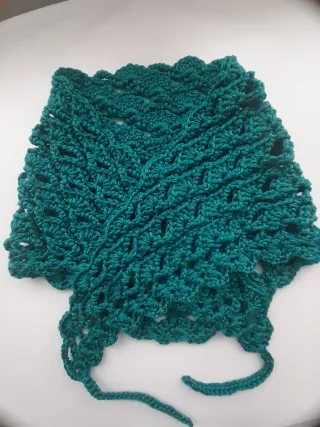 Preciosa toquilla tejida a mano con un diseño intrincado. - Color verde agua - Elaborada con hilo de calidad. - Textura suave y agradable. - Diseño abierto y ligero. - Lana de calidad muy calentita - Nueva sin estrenar -Mide 52 de largo por 160 de ancho ( tiras de atar aparte) - Se podría hacer más grande
