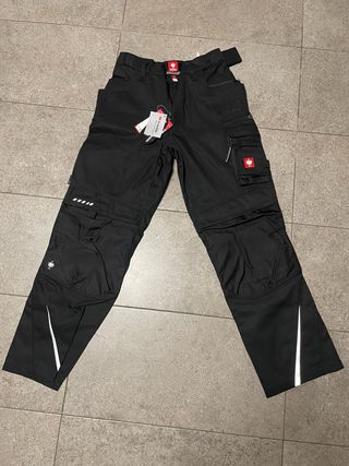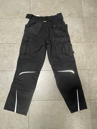 Pantalones de trabajo de la marca Engelbert Strauss en color negro. Diseñados para la comodidad y durabilidad en entornos laborales. - Bolsillos múltiples para herramientas y accesorios. - Detalles reflectantes para mayor visibilidad. - Cintura ajustable para un mejor ajuste.