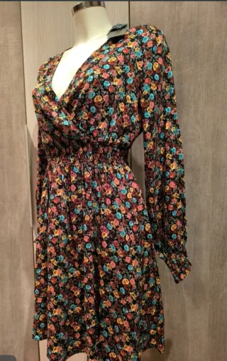 Vestido con un bonito estampado floral en tonos oscuros. Ideal para cualquier ocasión. - Diseño cruzado en la parte delantera. - Cintura elástica para un mejor ajuste. - Mangas largas abullonadas. A estrenar, talla M