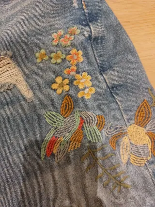 Tejanos Stradivarius con un diseño único. - Bordados florales coloridos. - Detalle de rotos desgastados. - Corte moderno.