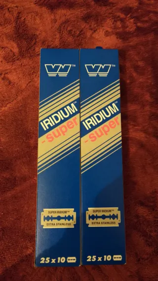 Paquete de 2 cajas de cuchillas de afeitar. - Modelo: IRIDIUM SUPER - Cada caja contiene 25 paquetes de 10 cuchillas cada uno. - Material: Extra Stainless.