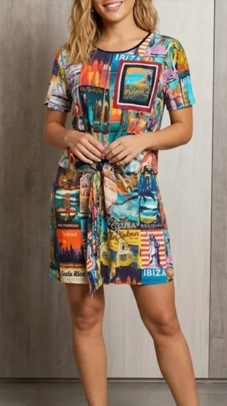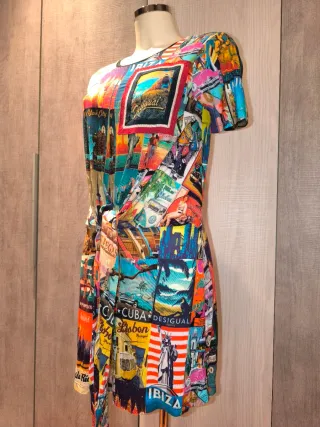 Vestido de verano con un estampado vibrante y original. - Diseño tipo collage con motivos de viajes, cuba, paris, New York, Hawaii, etc, - Manga corta. - Cintura anudada. - Largo hasta la rodilla. A estrenar, Desigual, tamla S a M