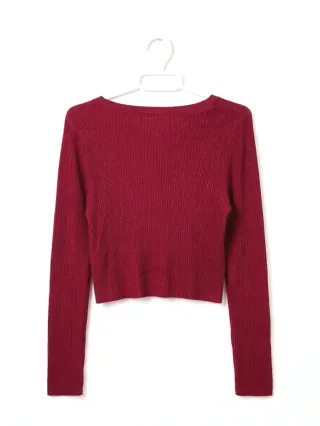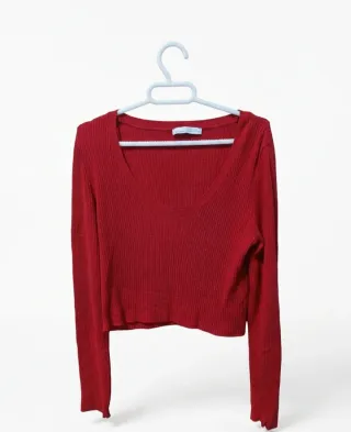 Jersey de manga larga y cuello redondo (queda bastante escotado). Jersey de punto fino en color rojo. Tejido acanalado Marca: Pull&Bear Talla: L Estado: Usado, pero en muy buen estado!