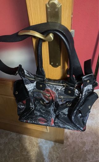 Bolso de la marca Desigual con un diseño llamativo y práctico. - Múltiples bolsillos exteriores para organización. - Combinación de colores negro y rojo. - Correa ajustable para llevar al hombro o cruzado.