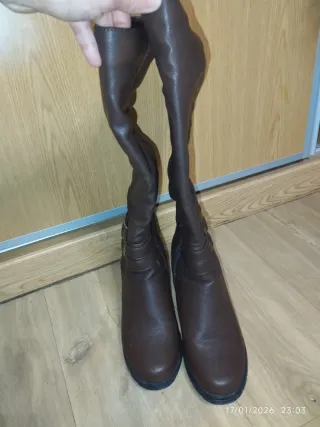 Botas de tacón de color marrón. - Diseño elegante. - Detalle de hebilla. - Material sintético.